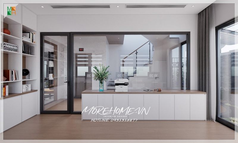 Giải quyết tối ưu được diện tích bằng tủ kệ âm tường kịch trần sử dụng được hết khoảng không phía trên đem lại sự gọn gàng và đẹp mắt cho không gian phòng