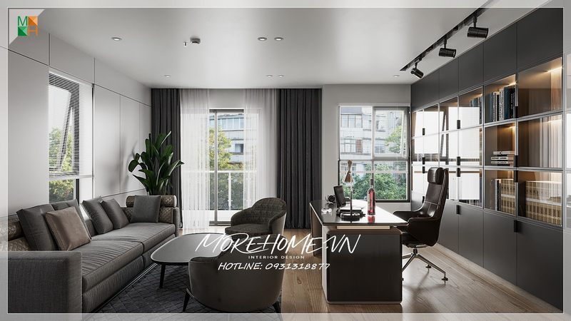 Phòng làm việc sẽ thoáng rộng hơn khi gia chủ lựa chọn kệ tủ trang trí âm tường gỗ hiện đại