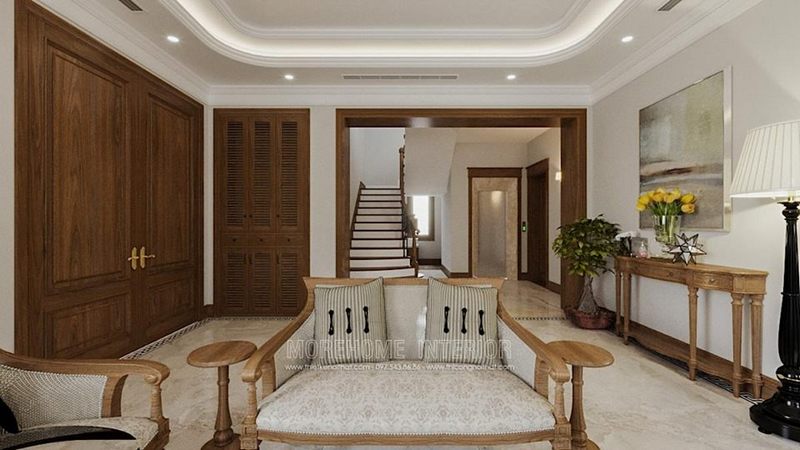 Những khoảng đá trắng nơi cổ bậc cầu thang đan xen trong các mặt bậc gỗ tự nhiên tạo nên sự cuốn hút khó tả trong không gian của biệt thự, nhà phố