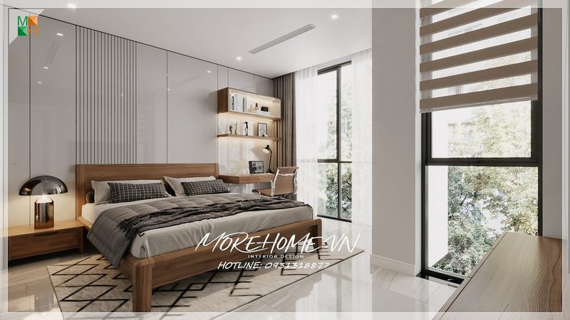 Phòng ngủ nội thất hiện đại được thiết kế với những chi tiết đơn giản mộc mạc, không cầu kì nhưng vẫn đảm bảo tiện nghi sử dụng và đẹp mắt.