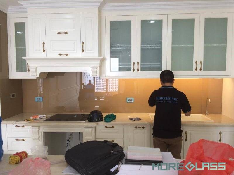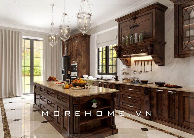 Tủ bếp được thiết kế theo phong cách cổ điển và được làm từ chất liệu gỗ tự nhiên nhập khẩu đặc biệt cho các biệt thự, chung cư cao cấp.