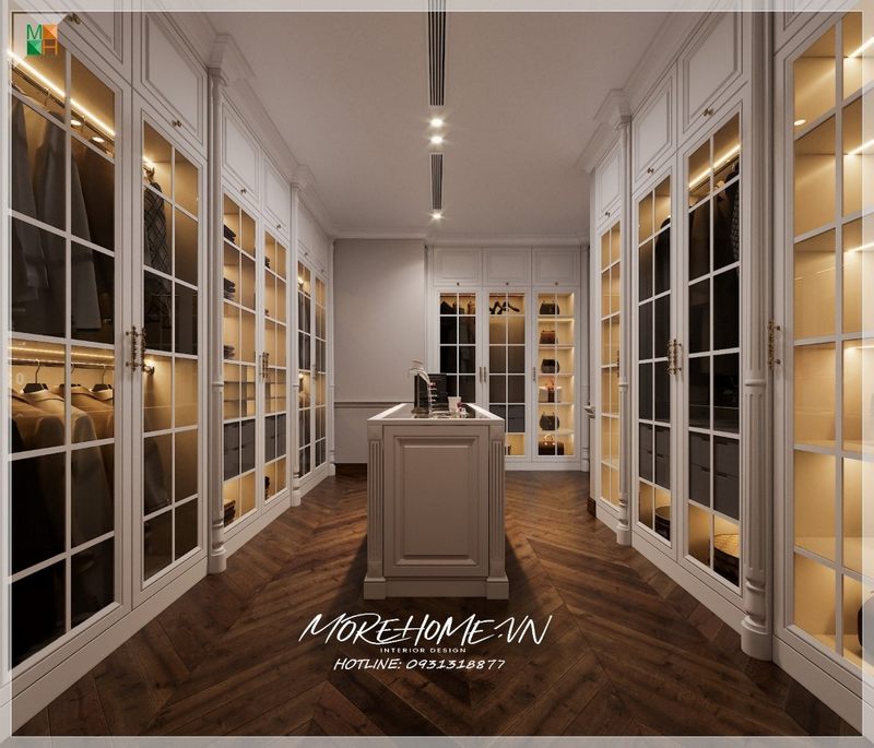 Hệ thống tủ quần áo phong cách đương đại kịch trần bằng gỗ tự nhiên sơn trắng kết hợp cánh kính sang trọng, mang đến sự hiện đại trẻ trung mà cao cấp cho không gian phòng thay đồ