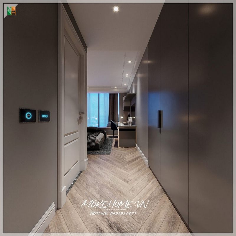 Thiết kế nội thất phòng ngủ hiện đại, sàn gỗ màu nâu trầm chủ đạo tạo cảm giác ấm cúng và thoải mái hơn